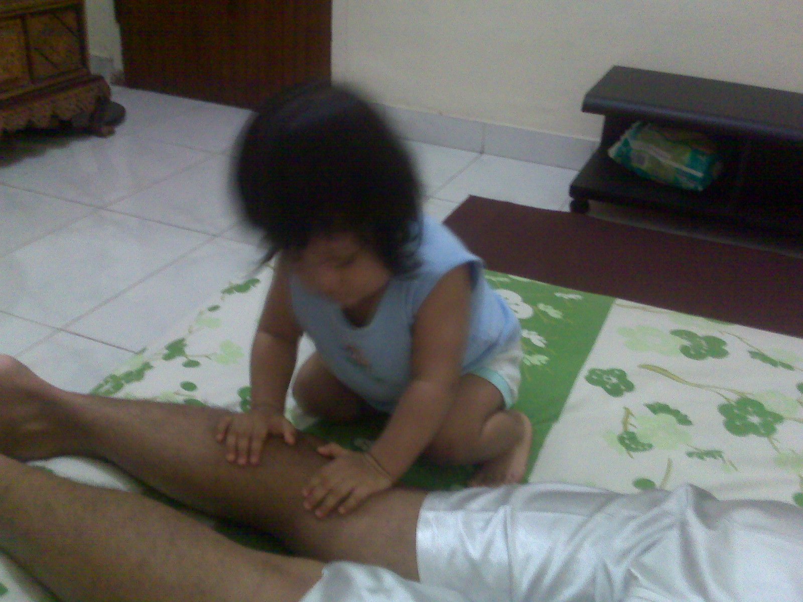 Kemaren pas Mama mijetin Papa, Zahra memperhatikan dengan seksama dan langsung bergabung. Mama pijet kaki sebelah kanan, Zahra sebelah kiri. Enak banget si Papa.. hahaha.. Tapi gayanya Zahra yang mirip tukang pijet beneran sukses bikin Mama Papa ketawa terbahak-bahak. Gayamu naaaakkkk…