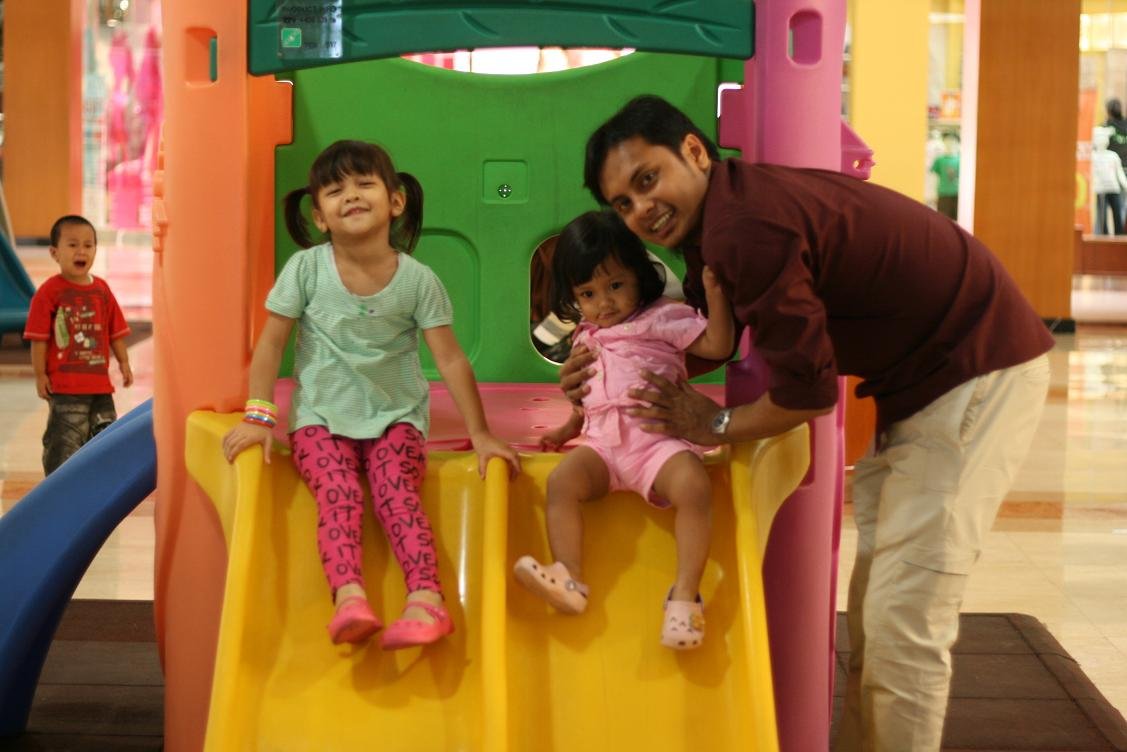 Eiya, pas di playground, ada balita yang pipis di perosotan. Udah besar kali ya jadi gak pake diapers. Yang agak mengganggu sebenernya, si Ibu ko gak bersihin pipis nya. Yak 😐 Memang sih mungkin dia bingung bersihin pake apa.. Tapi mungkin pampers adiknya bisa buat ngelap atau tissue atau apapun supaya gak becek. Atau at least kasih tau cleaning service kalo anaknya gak sengaja pipis di perosotan jadi minta tolong dibersihin.. Ini ngga, dibiarin gitu aja. Sampai ada anak lain yang datang maen disana dan nginjek, kaos kakinya basah. Yak 😐 Aku langsung ganti tempat playground. Untung PIM punya banyak.