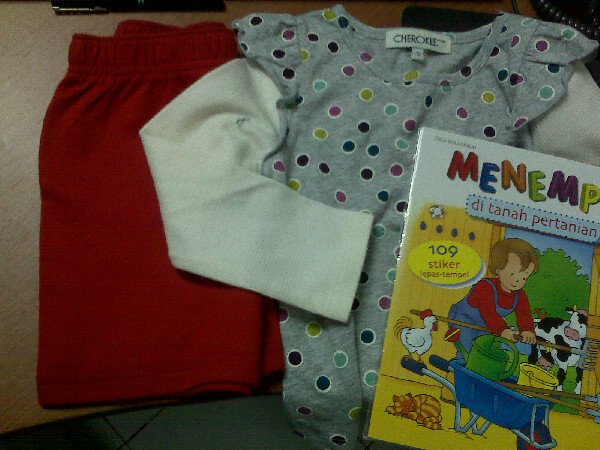 Nah selain belanja baju aku suka sekalian beli buku di toko buku kecil sebelah toko sepatu BATA di sabang. Murah2 mayan, buku tebel gitu ukuran panjang 30cm harganya 15ribu, trus buku barney 2 buah 15ribu, trus buku menempel (foto diatas) itu 10ribu satunya. Zahra skrg lagi suka menempel, jadi aku stock aja buat dia maen, abis itu dia sobek-sobek sih.. gpp lah murce ini, biar dia sekalian belajar juga, lumayan sekarang udah bisa milih “mau ini, tempet (tempel) sapi, tempet ayam, tempet bebek” gitu gitu deh.. Aku juga suka beli buku resep, disini jual buku-buku Gramed dg harga miring, misal yang dijual 35rb jadi 20 ribu sajah. Tapi ya persediannya juga musiman, again, karena gue rutin jadi kesaring tuh yang bagus ke kantong belanjaan gue. Huuraahhh…