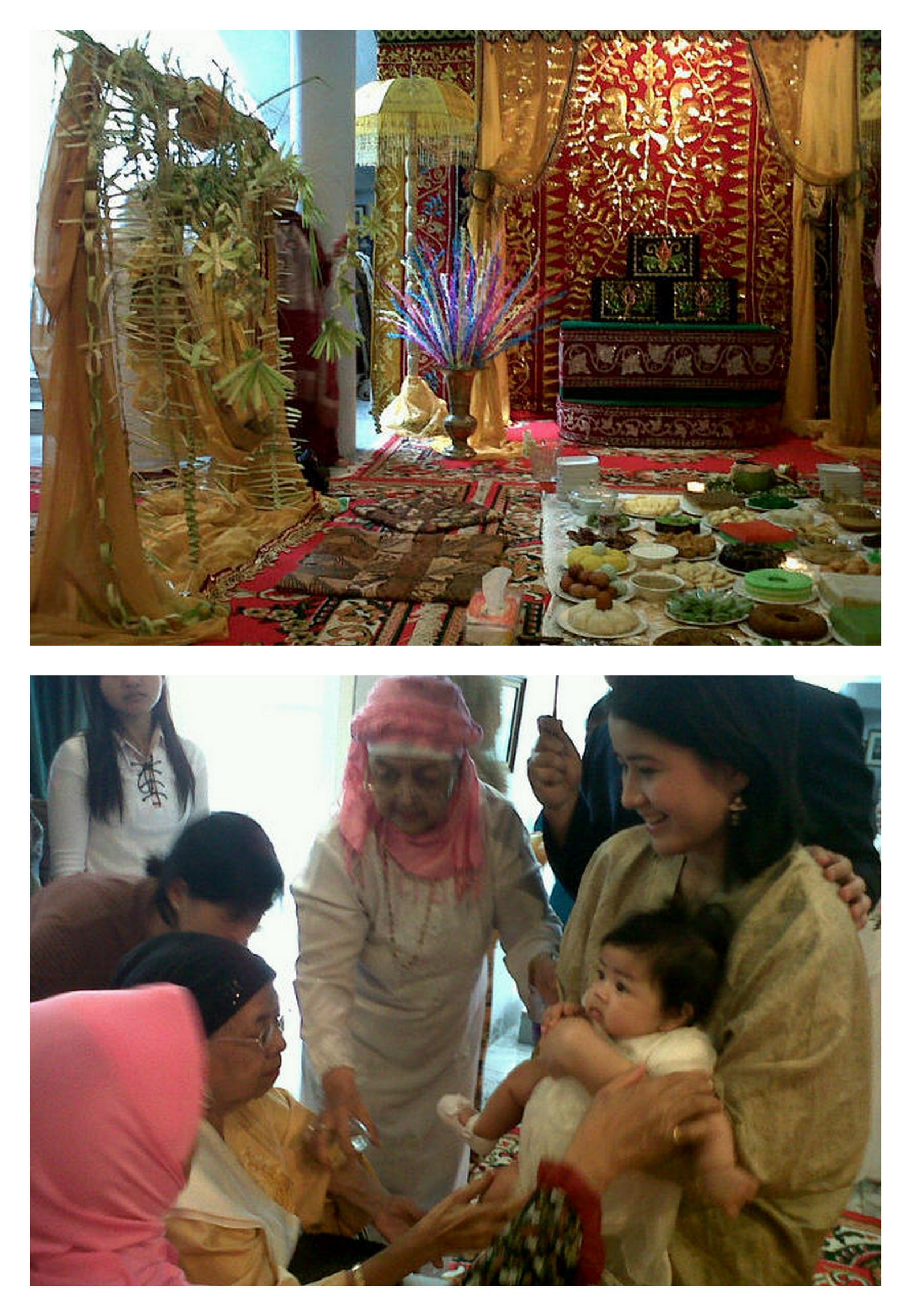 oooh.. aku baru pertama itu ktm ibu jilbab pink jeng.. gak tau saudara atau yang bantu bu elly kasim utk prosesi adat nya yah? yang aku inget ibu itu bawa parfum, trus tiap yang salaman ama bayinya di semprotin parfum.. sepupu gue mewek soalnya itu parfum mahal.. hahaha…