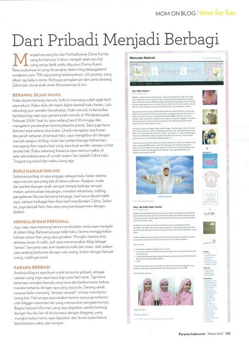 Sekitar 1 bulan yang lalu aku dapet email dari majalah Parents Indonesia, katanya blog ini akan di featured di rubik Mom on Blog. Waw.. antara senang dan bingung juga sih, kok bisa terpilih, Alhamdulillah.. pastinya lebih banyak senengnya ๐ Ada beberapa pertanyaan diemail yg harus aku jawab dan akhirnya udah release di edisi bulan Maret 2012. Thank you Parents Indo :-*