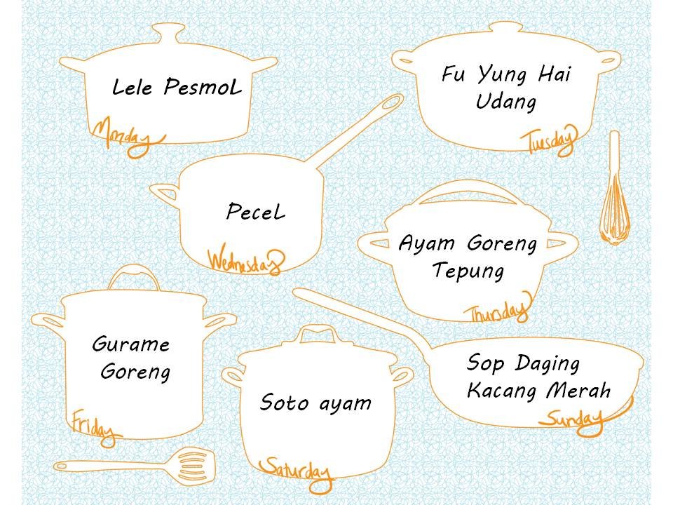 Kalo untuk ngatur menu aku sih pegang tips dari Mama ku. Dalam seminggu itu paling ngga ada 2 menu ayam, 2 menu daging dan 2 menu ikan/seafood.