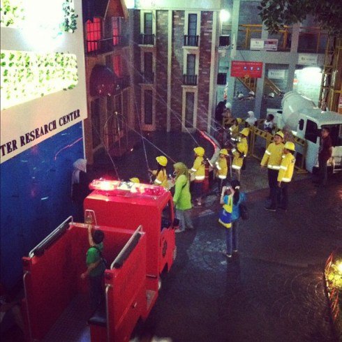 Abis itu waktu di scan gelangnya ternyata Zahra harus “lapor” ke kantor imigrasi, jadi kita cari dulu tuh kantor imigrasi. Duile.. agak-agak ribet juga ya, gak bakal di deportasi kan? haha.. Trus karena dari awal masuk udah heboh banget ada mobil pemadam kebakaran, Zahra bilang mau jadi pemadang kebakalan.. Profesi ini tampaknya faforit deh, karena antriiii… Tp alhamdulillah Zahra mau duduk tenang antri sampe gilirannya dateng. Lucuuuu banget anak2 kecil ini pake baju pemadam kebakaran, trus naik mobilnya, trus pura-puranya padamin api di gedung tinggi gitu.. abis itu digaji deh π