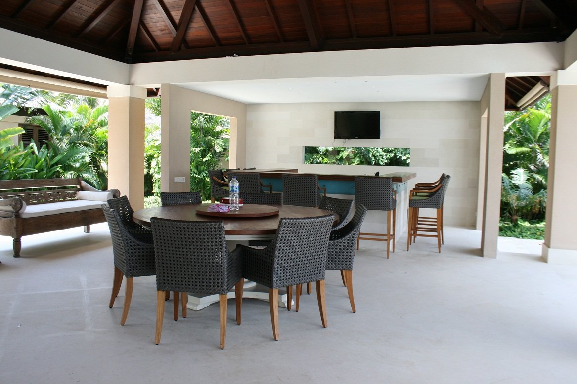 Dan diujung lorong ada ruang tamu lagi dengan sofa yang besar, round table dan bar dengan pemandangan kolam renang warna biru muda, gradasi dengan hijaunya rumput dan birunya lautan luas.