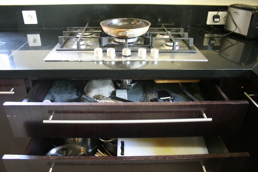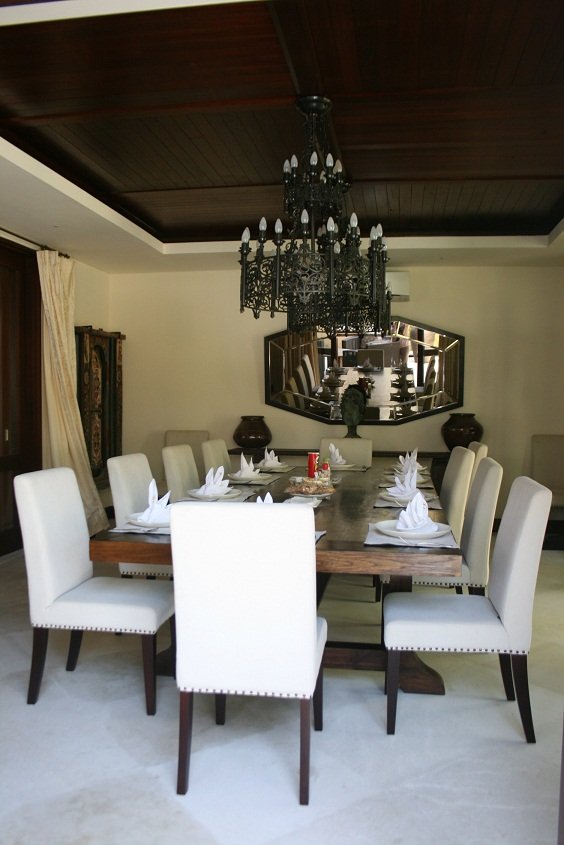 Kita lalu turun kebawah, kali ini nyisirin sisi kiri villa.. Sebagai emak-emak aku langsung liat dapurnya dong ya.. Wih lengkap bgt. Ada kompor, oven, microwave, panci dan segala peralatan masak, bahkan juicer juga ada. Kulkas yang besar dan… ada walk in closetnya!! Tp isinya dishes.. itu namanya kitchen closet apa gmn? *gakgaul* Inspirasional sekali.. Chef akan datang tiap pagi untuk masak breakfast. Juga ada 2 orang room service yang stand by dari pagi kita bangun tidur sampai malam kita mau tidur.