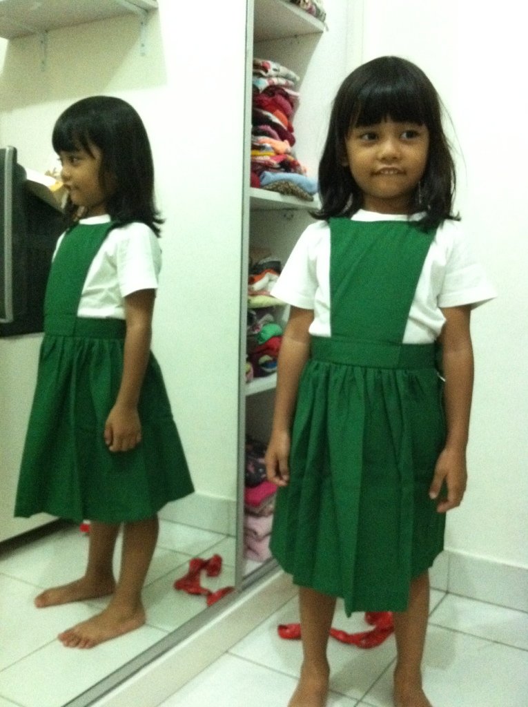 Zahra udah jauh-jauh hari di kasih tau kalau mau ke sekolah baru. Dia kayanya seneng sama seragam baru nya yang pake rok. Emak babe nye udah harus siap tapi ama iuran bulanan sekolah yang naik hampir 100% dari di playgroup kmrn. Belon lagi katanya suka ada biaya-biaya acara apalah.. moga-moga jangan sering-sering 😛