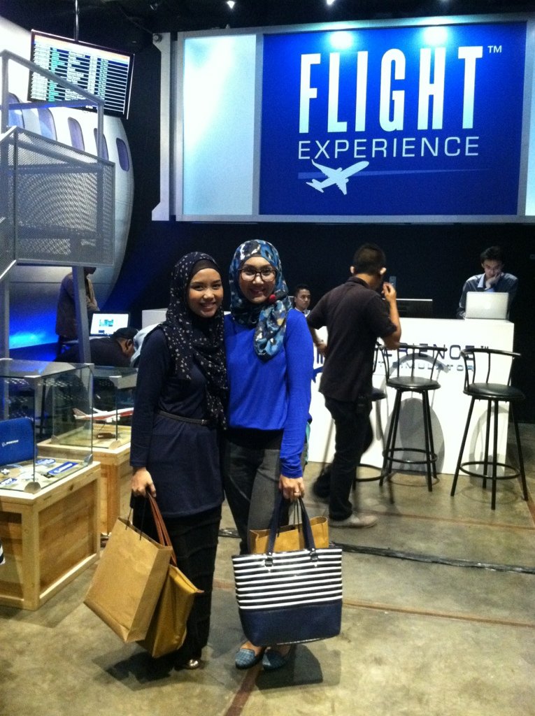 Akhirnyaaa kesampean juga loh masuk diruang cockpit pesawat di Flight Experience di Gandaria City, hari Kamis minggu lalu, soalnya ada launch party-nya Travelers Daily. Pulang kantor langsung cabs ikut temen kantor yang kebetulan istrinya juga ikut acara ini hihi.. Alhamdulillah orang melas didengar Allah jadi dapet tebengan : )) Jadi baju kantor disesuaikan ama dress code nya TD Launch Party pake warna biru.