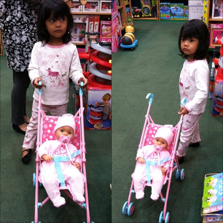 Akhirnya boneka yang di idamkan dibeliin juga sama Nena nya. Dia langsung dorong2 bonekanya pake stroller di mall. Orang-orang sampe pada ngeliatin.. Kocak kali ya..