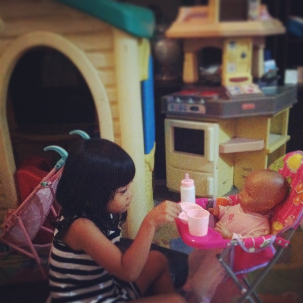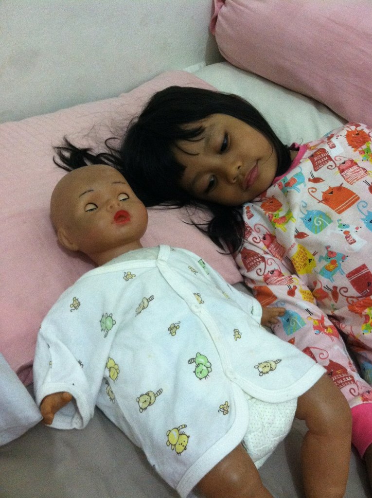Zahra makin getol aja ngurus “anak” nya. Aku inget dari umur 2thn dia udh ngerengek minta dibeliin boneka bayi, tapi aku bilang nanti nanti aja. Bukan apa-apa… Sereeemmm abisnyaaa huhuhu.. Paling takut deh sama boneka bayi, mbak spg nya bilang “ini lucu kok bu gak serem. Ini ada yg bisa ada suaranya kalo di pencet perutnya, trus yang ini bibirnya bisa gerak-gerak bu kalo dikasih susu” Hiiiiii malah tambah serem mbaaaaak…