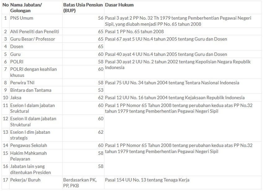 Kalau liat tabel pensiun di atas, jadi masih masuk akal sebetulnya kalau serikat mengajukan pensiun di perpanjang sampai usia 58 tahun. Karena sebetulnya dalam UU No. 13 Tahun 2003 tentang Ketenagakerjaan tidak mengatur kapan saatnya pensiun dan berapa Batas Usia Pensiun (BUP) untuk pekerja sektor swasta.