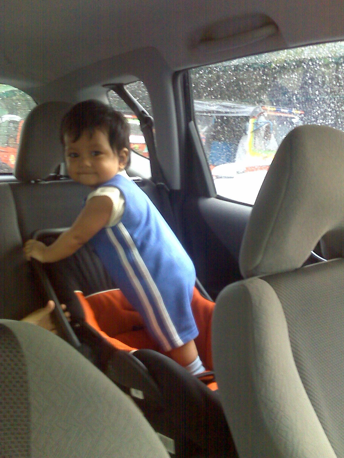 Padahal dari bayi udah dibiasain duduk di car seat. Tapi sejak bisa berdiri Zahra gak bisa diem. Udah mama bilang car seat itu buat duduk, bukan untuk di panjat, apalagi berdiri diatasnya, gak mempan… Kalo di pakein sit belt dia ngamuk.