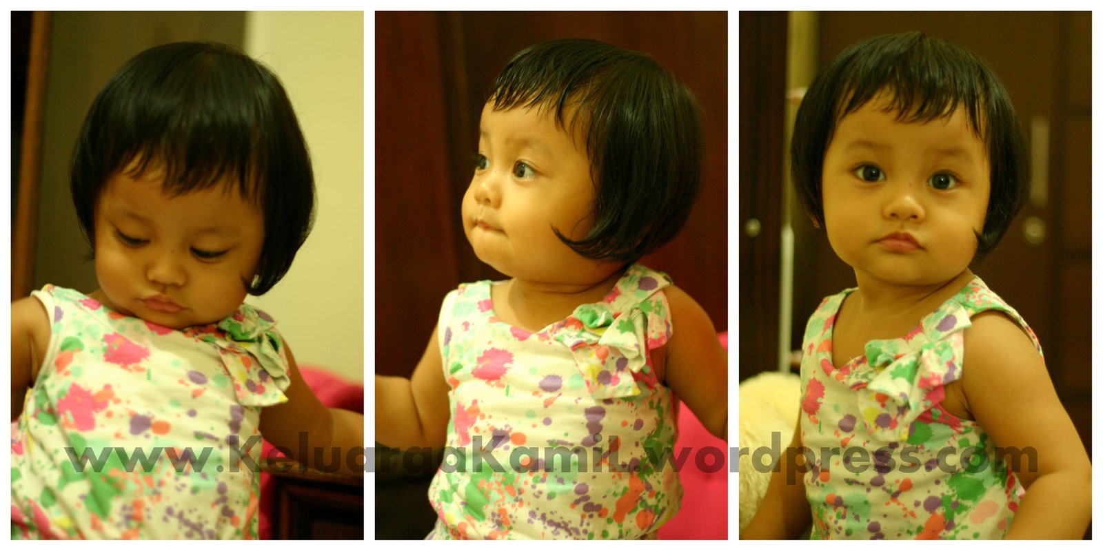 Aku minta poninya dipotong super pendek trus agak di trap. Maxudnya sih biar lama panjangnya, dan gak ganggu. Lagian udah bayar mahal, biasanya sih aku aja yang potong pake gunting 😀 Bagian sampingnya minta dirapiin, karena ternyata rambut samping Zahra emang lebih panjang dari belakangnya jadi potongannya gak sengaja jadi asimetris. Karena poninya pendek, mukanya jadi lebih kliatan bulet.. Zahra jadi kliatan tambah gendut. Eh ko jadi kaya Dora versi gembul ya..