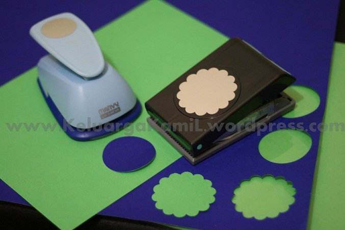 Aku beli 2 punch : Bentuk scallop (bunga) diameter 2.25 inch atau sekitar 6cm. Merk EK success. Bentuknya slim, dan keren, tapiii beraaatttt…. Untung yang satu lagi aku beli circle punch size 2 inch / 5 cm merk Marvy Uchida jauh lebih ringan. Fiuh..