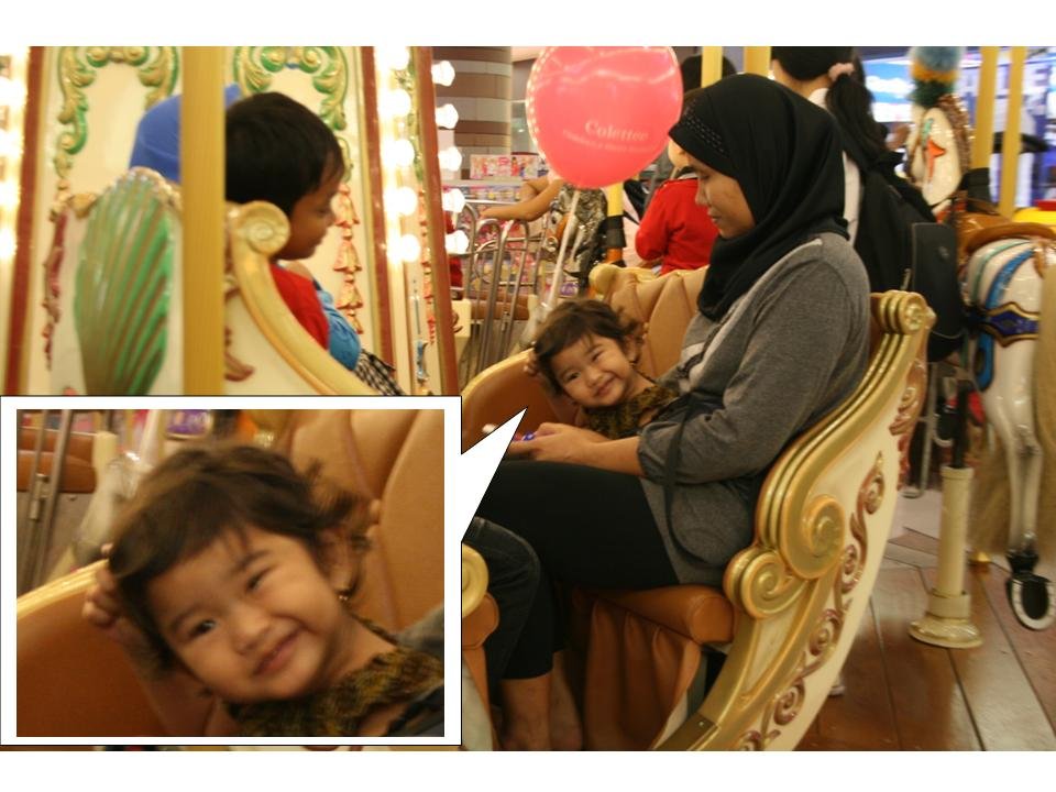 Begitu nyampe ke Miniapolis, Zahra langsung nagih naik Carousel, “kuda.. kuda.. mau..” hehe.. ya ya sabar ya nak, mama beli tiketnya dulu. Untung si Meryl punya member card, jadi diskon bow.. mayan deh mak irit. Abis naik Carousel dan gak mau turun sebenernya, Zahra nyobain naik Choo Choo Train. Ini pertama kalinya dia naik train, sebelumnya cuma naik Carousel aja. Dan bener aja sih ekspressinya datar, haha..ga terlalu excited kynya naik train. Tapi kalo Azka, Ganesh ama Maira kynya lebih suka naik Train.