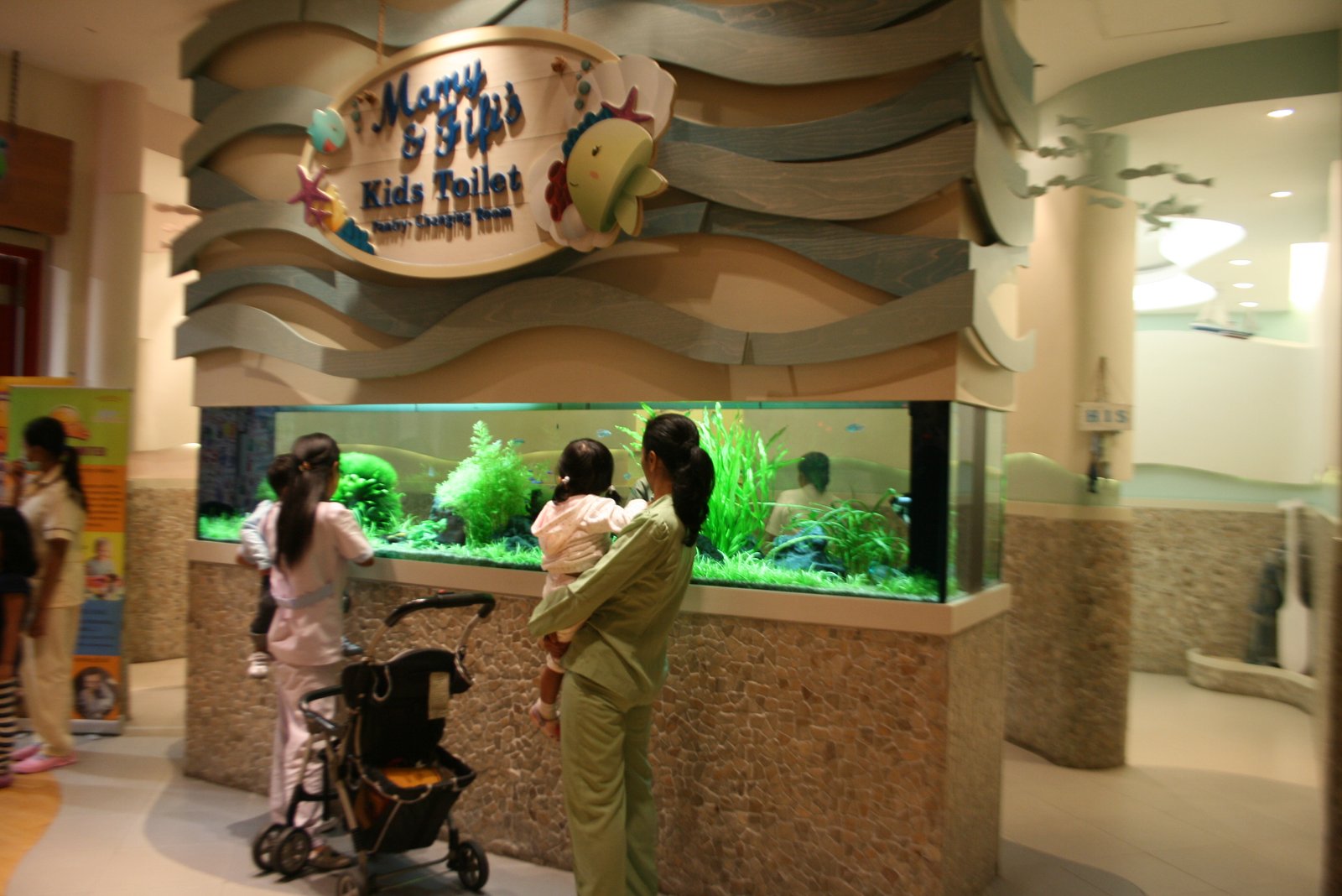 Oiya, diantara semua spot di Miniapolis, aku paling suka sama.. Kid’s Toilet-nya! Rasanya pengen pipis disitu tiap hari *lebay* Design interiornya tema Laut. Entrancenya ada aquarium hijau yang cantik, dan pintu toilet dibuat dari kayu ala sailor gitu. Kalo toilet cewe warnanya pink. Mereka bahkan naro gantungan tas bentuk huruf SEA, segitu detailnya ya.. Keren deh.