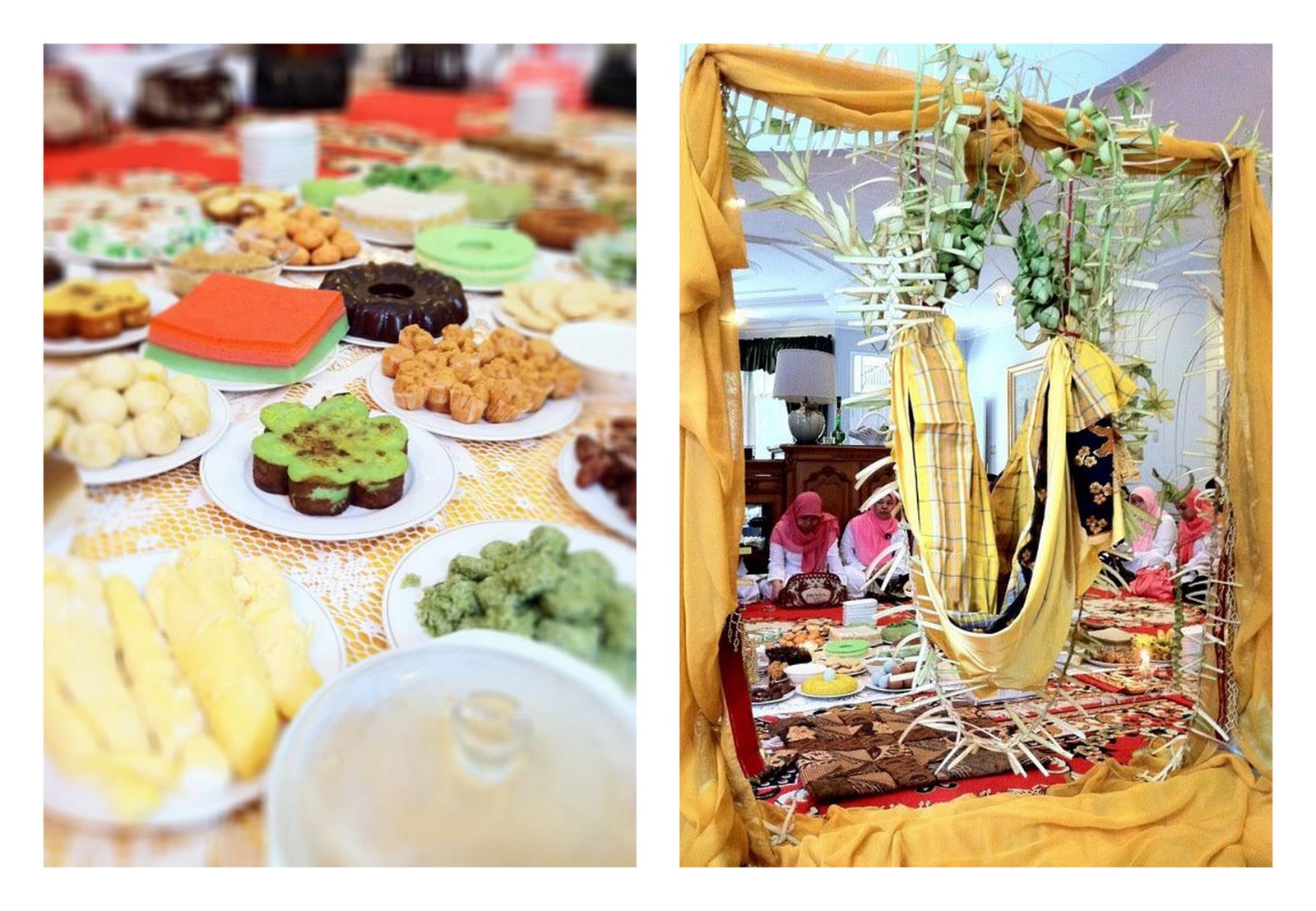 Hari Minggu kemarin dalam sehari kita dapet undangan dari keluarga. So it’s a big family day! Dan uniknya dalam 1 hari itu kita dateng ke 2 upacara adat dari 2 daerah berbeda. Yang pertama adalah upacara Baayun anak ala Banjarmasin. Kan keluarga ayahku dari banjarmasin kalimantan selatan. Seru deh hihi.. jadi kan ini kaya upacara bayi gitu. Ada pengajian, trus “pengantennya” turun, keliling disalamin tamu, baru di ayun pake ayunan kain yg dihias gitu. Ada pelaminannya segala, dan kue-kue sesaji ala banjarmasin yang super lengkap.