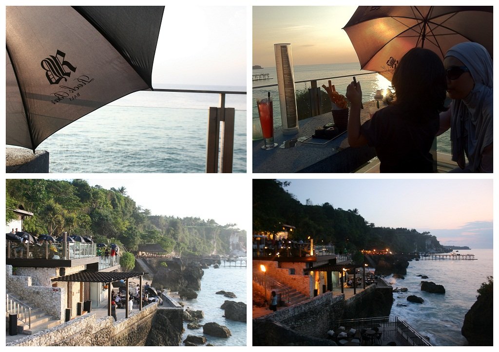 Sbnrnya bisa juga turun tangga dari Kisik Resto, tapi bok!! gemporrrr.. anak tangganya ga ada abisnya. Untung kita udah nanya ktnya sunset kan jam 6.15 lah ya.. jadi ktnya kita masuk 5.30 aja masih sempet. Dan ternyata emang… panaaasss sodara2!! Emang sih kita disediain payung gitu.. ya bayangin aja kita kan diatas tebing di tepi pantai gitu.. jadi panasnya ya gitu deh gerah biar udah dikasih handuk dingin juga.. baru sekitar jam 6 udah rada adem dan payung-payung pun mulai pada dilipet.