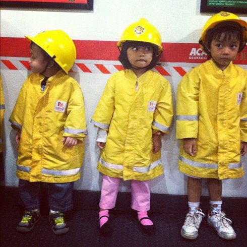Abis itu waktu di scan gelangnya ternyata Zahra harus “lapor” ke kantor imigrasi, jadi kita cari dulu tuh kantor imigrasi. Duile.. agak-agak ribet juga ya, gak bakal di deportasi kan? haha.. Trus karena dari awal masuk udah heboh banget ada mobil pemadam kebakaran, Zahra bilang mau jadi pemadang kebakalan.. Profesi ini tampaknya faforit deh, karena antriiii… Tp alhamdulillah Zahra mau duduk tenang antri sampe gilirannya dateng. Lucuuuu banget anak2 kecil ini pake baju pemadam kebakaran, trus naik mobilnya, trus pura-puranya padamin api di gedung tinggi gitu.. abis itu digaji deh π