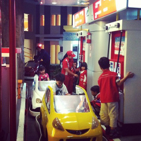 Trus udah siang tuh, Zahra udah mulai ngantuk, udah rewel gak mau antri kerja jadi dokter, ga mau ngapa-ngapain, yaudah kita beli Pizzania dulu, yang tyt enaaaak.. rotinya empuk, kejunya juga gurih. Abis makan baru rada semangat lg trus kita jelajahin di lantai 2. Lah ternyata permainannya banyak juga di lantai 2. Ada dapur-dapuran untuk anak dibawah 4th, ruang permainan kaya puzzle, buku dll lengkap ama sofa dan piano kecil, salon kecantikan, rumah kaca berkebun, dan paling banyak di lantai atas itu profesi pekerja pabrik gt, pabriknya macem2 dari mulai coklat silver queen, pop mie, wafer sampe susu frisian flag. Zahra suka disini soalnya abis kerja selain dpt uang juga dapet produknya. Dapet susu Frisian Flag deh π