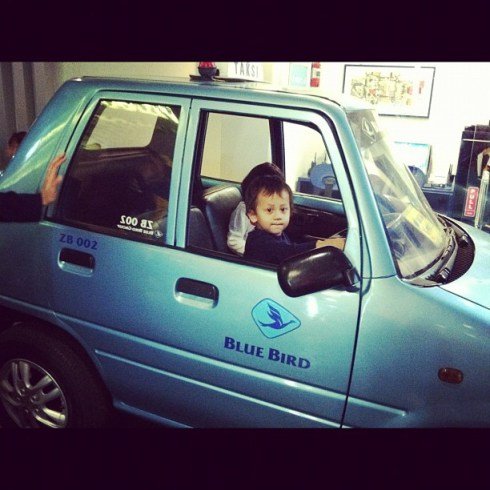 Abis jadi petugas pom bensin jalan2 tour keliling kota naik Big Bird, bayar loh, 5 kidzos π Karena Zahra udah digaji jadi punya uang deh.. Naik taxi blue bird nya juga bayar.
