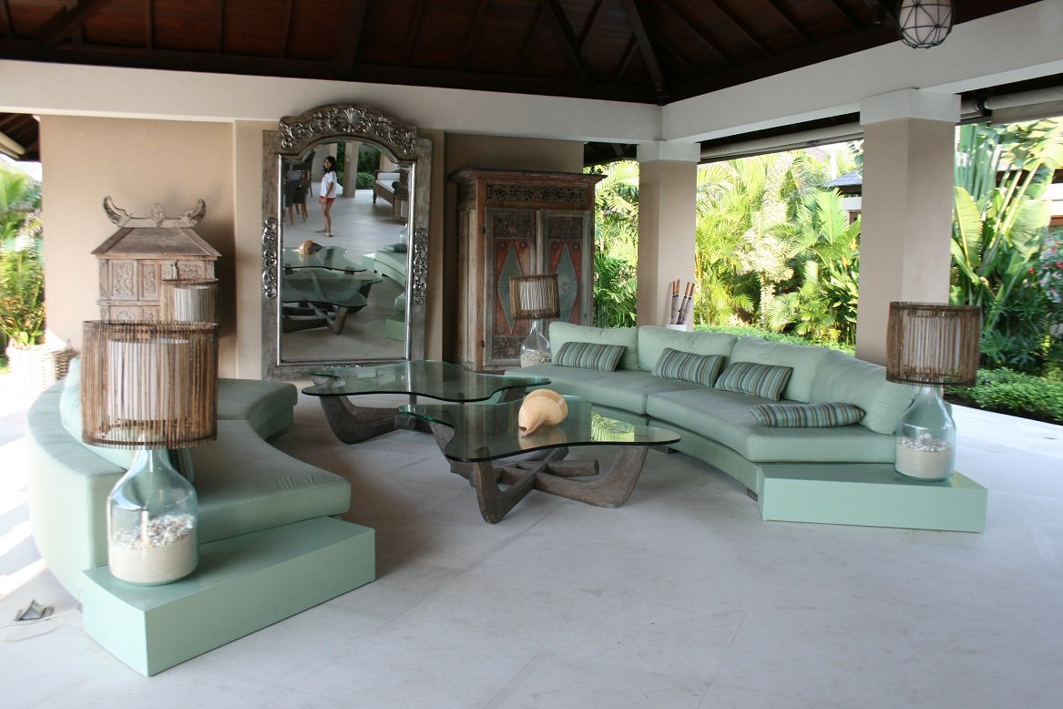 Dan diujung lorong ada ruang tamu lagi dengan sofa yang besar, round table dan bar dengan pemandangan kolam renang warna biru muda, gradasi dengan hijaunya rumput dan birunya lautan luas.