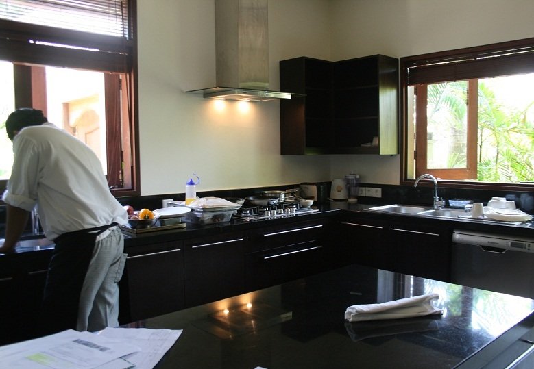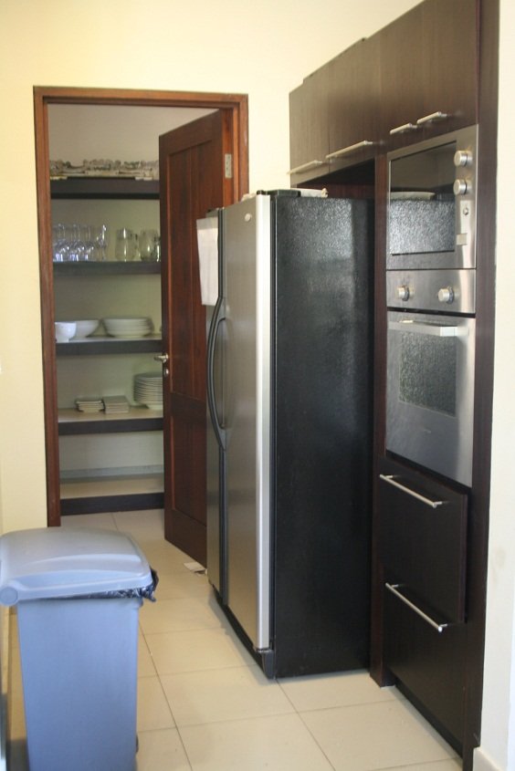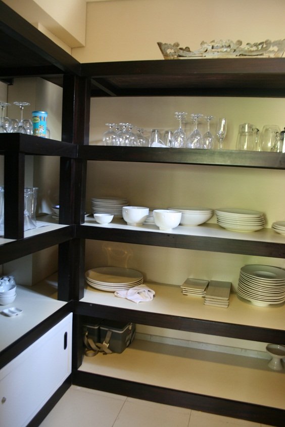 Kita lalu turun kebawah, kali ini nyisirin sisi kiri villa.. Sebagai emak-emak aku langsung liat dapurnya dong ya.. Wih lengkap bgt. Ada kompor, oven, microwave, panci dan segala peralatan masak, bahkan juicer juga ada. Kulkas yang besar dan… ada walk in closetnya!! Tp isinya dishes.. itu namanya kitchen closet apa gmn? *gakgaul* Inspirasional sekali.. Chef akan datang tiap pagi untuk masak breakfast. Juga ada 2 orang room service yang stand by dari pagi kita bangun tidur sampai malam kita mau tidur.