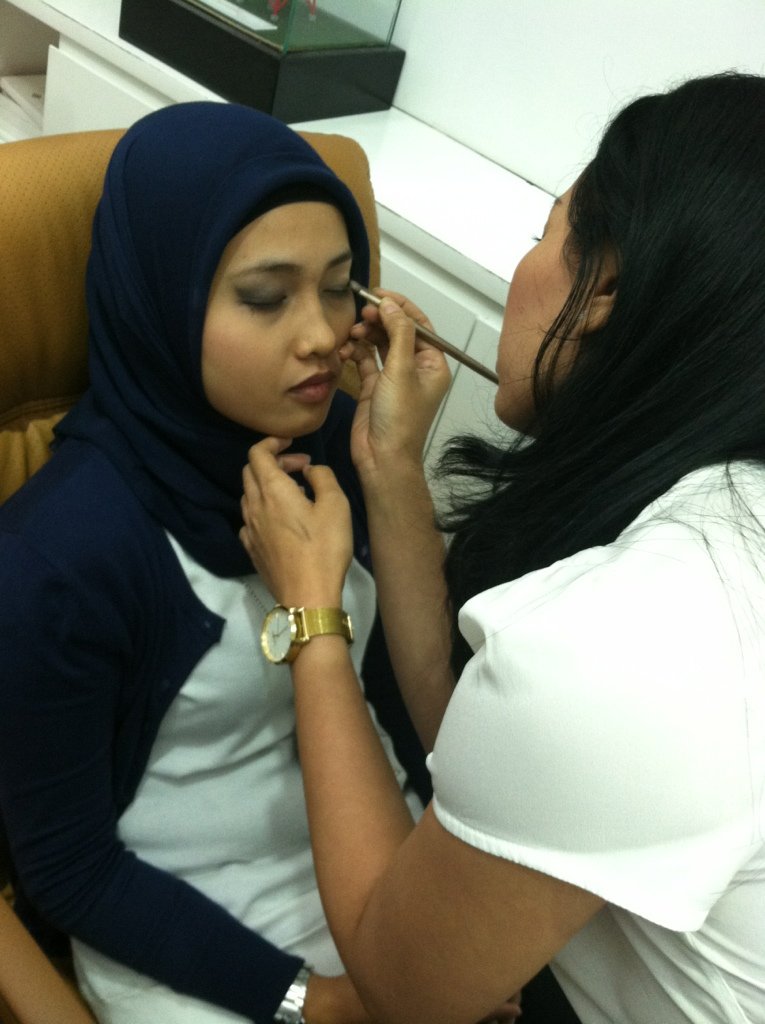 Iseng kmrn Kamis kan aku bawa alat make up, trus ngedandanin Rini yg ga pernah make up-an di kantor. Aku dandanin soft aja pake dominasi warna coklat yg natural. Eeeh jadi beda loh langsung, hihi..