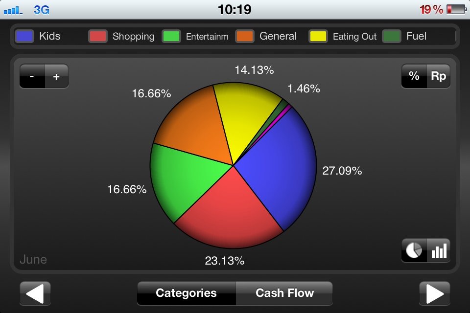 Sebenernya udah 3 bulan ini aku rajin nulis tiap detail pengeluaran aku di aplikasi iPhone namanya “Spending”. Canggih deh kita bisa input per kategori pengeluaran, misal shopping, kids, entertainment, clothes etc.. trus bisa keluar grafik/bagan nya. Kemana aja yak gue baru tau hehe.. Kliatan deh selama 3 bulan ini rata-rata sisa uang kita segitu, trus paling banyak habis buat Kids (dana pendidikan, beli maenan, biaya weekend maen di playground) sama Entertainment (bulan Juni kita ke Dufan ama ke Trans Studio ternyata mayan juga ya jajan muluk T_____T).